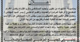 المهندس رمضان هلال النقيب العام يوصى برفع نسب الخصم بمستشفى الجيزة الدولى (التطبيقيين ) لأعضاء النقابة وأسرهم بداية من غدا السبت ٣ يناير ٢٠٢٦.