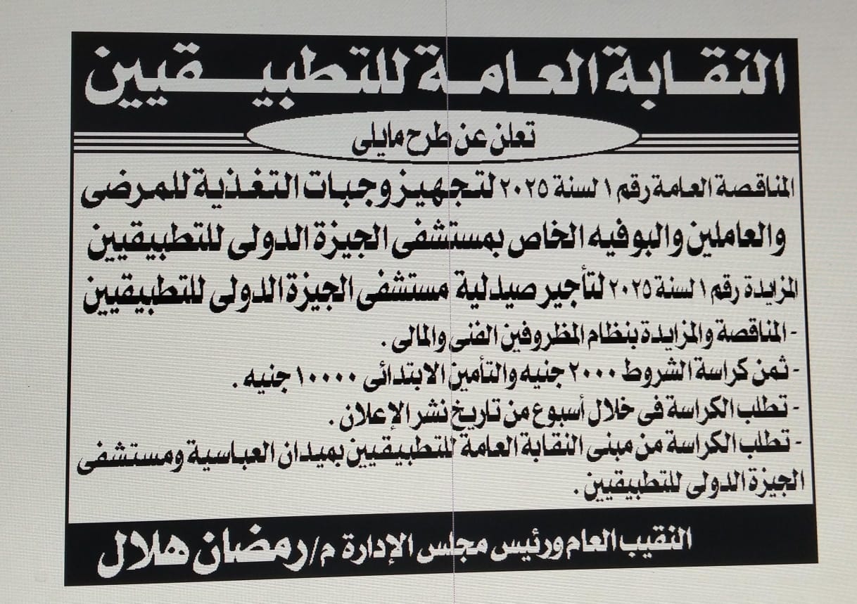 ويتم طلب كراسة الشروط من مقر النقابة العامة للتطبيقيين ببرج التطبيقيين بميدان العباسية ومقر مستشفى الجيزة الدولى بشارع الهرم