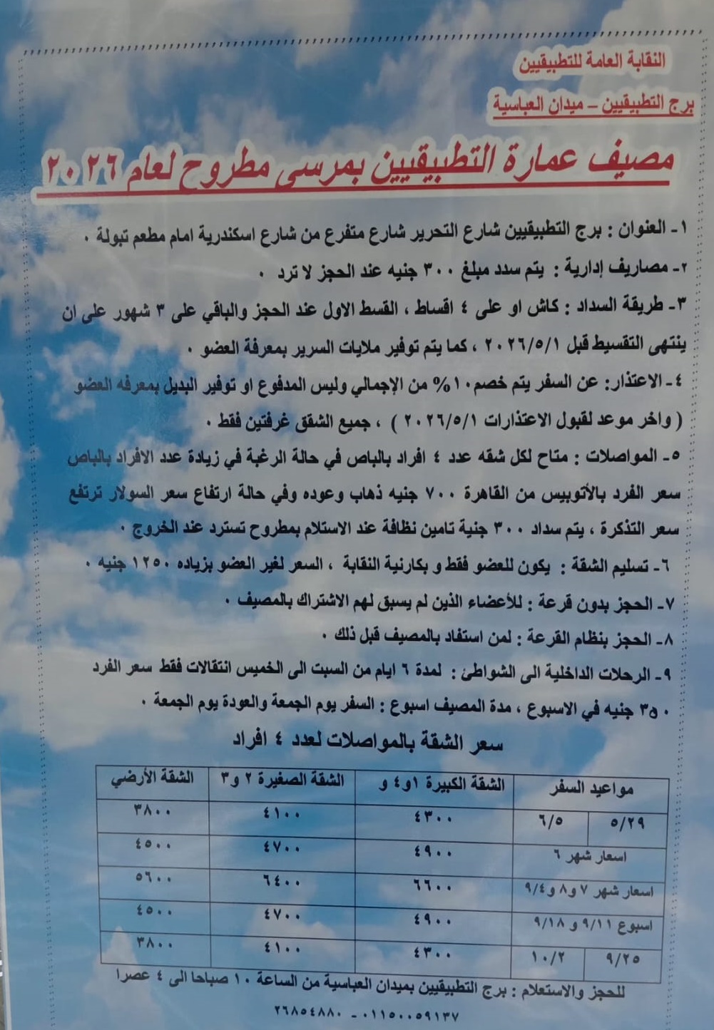 بدء الحجز بمصيف عمارة مطروح 25/03/2026 أخبار النقابة, الفرع الرئيسي, النقابات الفرعية 3 زيارة مقالات مشابهة تنويه بموعد صرف دفعة المعاشات المستحقة فى إبريل 2026 12/04/2026 السيد النقيب العام ينعى نقيب بورسعيد صديق رحلة الكفاح 02/04/2026 دعوة السيد النقيب العام لحضور الجلسات التأسيسية لنقابة التكنولوجيين 25/03/2026 بدء الحجز بمصيف مرسى مطروح 24/03/2026 تهنئة السيد النقيب العام بمناسبة عيد الفطر 19/03/2026 بدء الحجز بعمارة مرسى مطروح شقق وبرامج للفرد شاركها